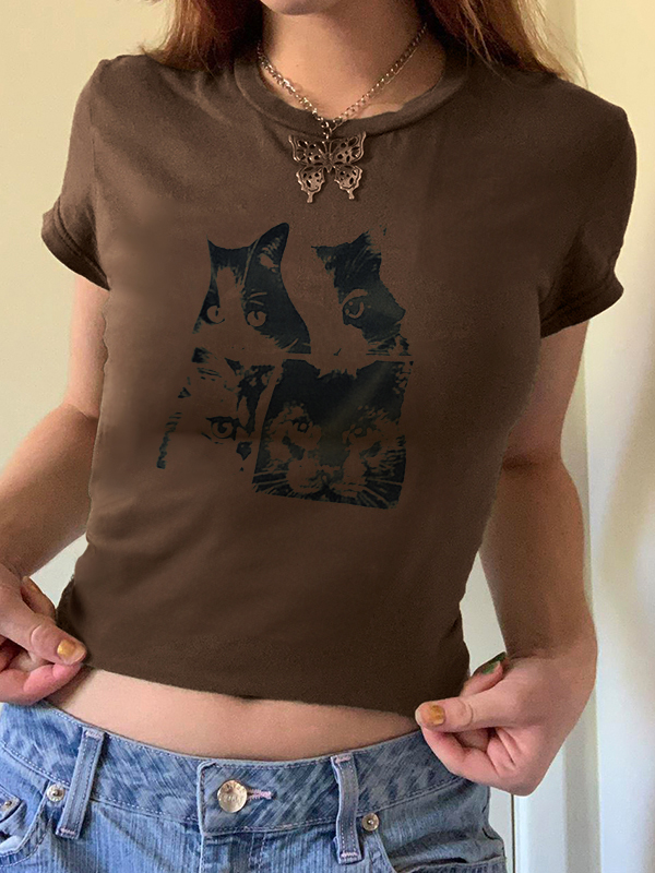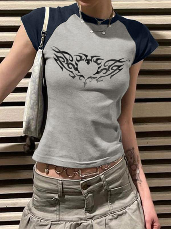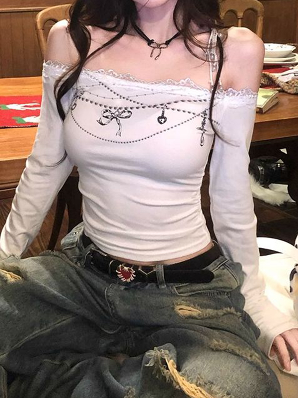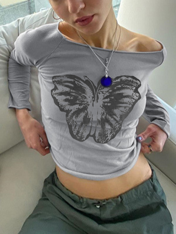 Vintage Butterfly Print Slanted Shoulder Long Sleeve Tee