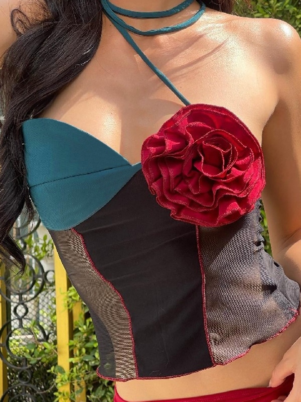 Three-dimensional Flower Decor V Neck Halter Corset Top